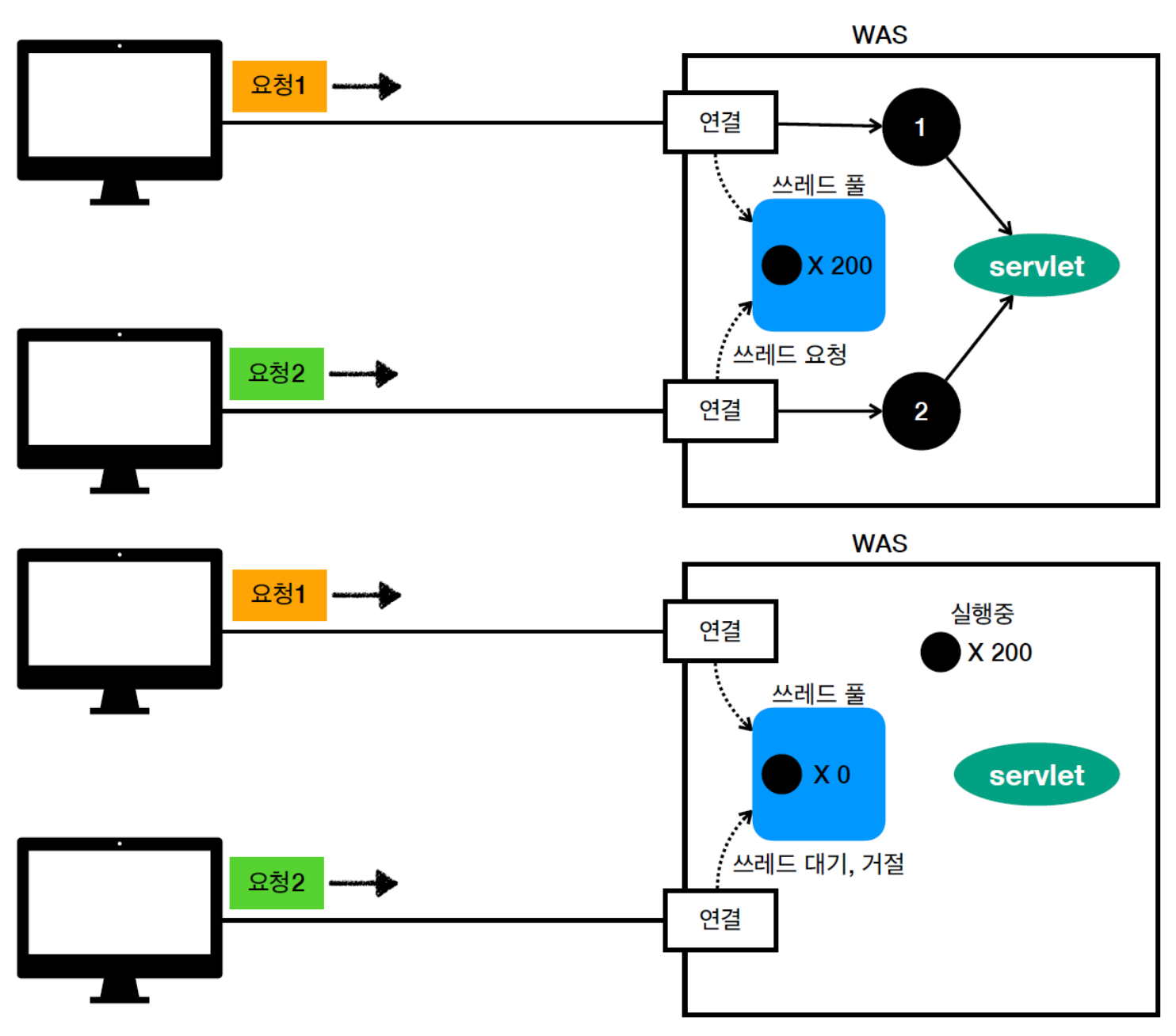 - 멀티 쓰레드와 쓰레드 풀: WAS는 동시 요청을 처리하기 위해 쓰레드를 미리 만들어 놓는 '쓰레드 풀' 방식을 사용한다. 이 쓰레드 개수를 적절히 설정하는 것이 서버 성능 튜닝의 핵심이다.