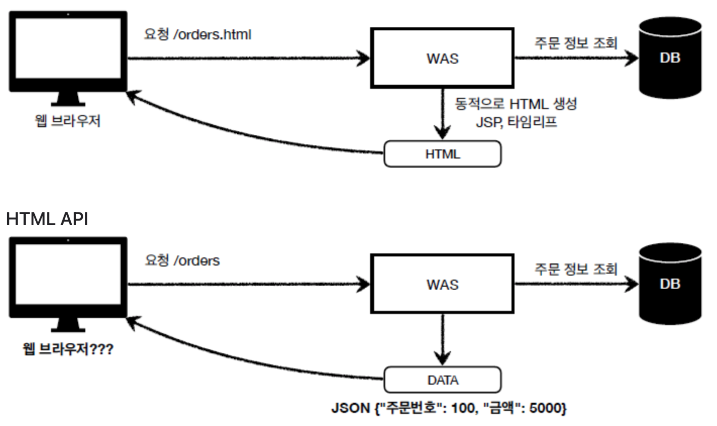 - HTML 페이지: 서버에서 동적으로 HTML을 생성해서 제공 (JSP, Thymeleaf).