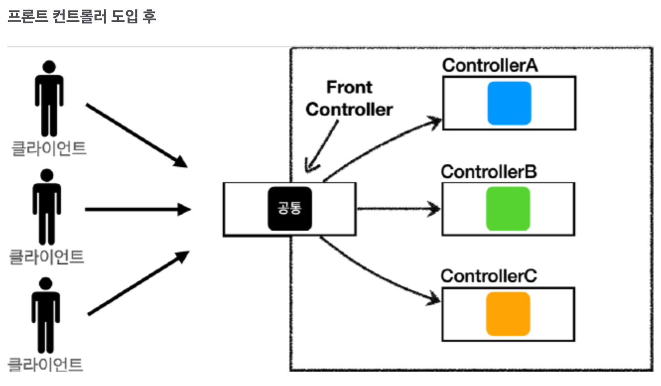 이전에는 클라이언트가 각 컨트롤러를 직접 호출했다면, 이제는 수문장(프론트 컨트롤러)이 딱 하나 서서 모든 요청을 먼저 받는다.