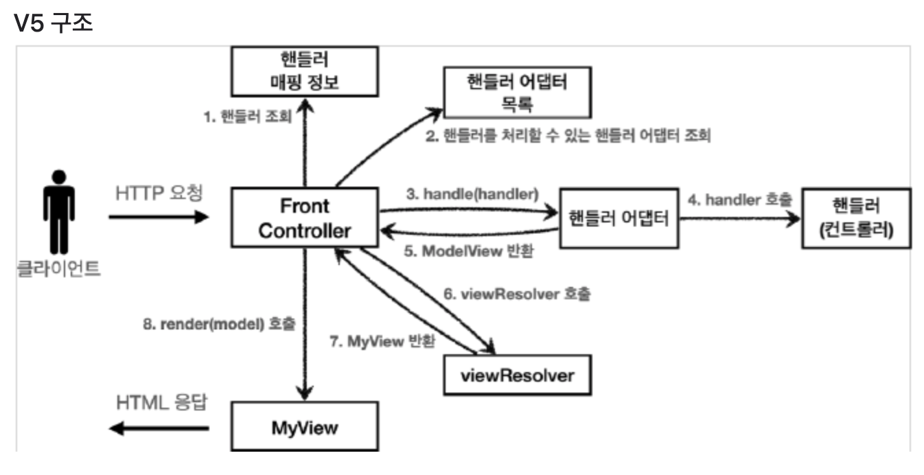 - 이전에는 프론트 컨트롤러가 실제 컨트롤러를 호출했지만 이제는 이 어댑터를 통해서 실제 컨트롤러가 호출된다.