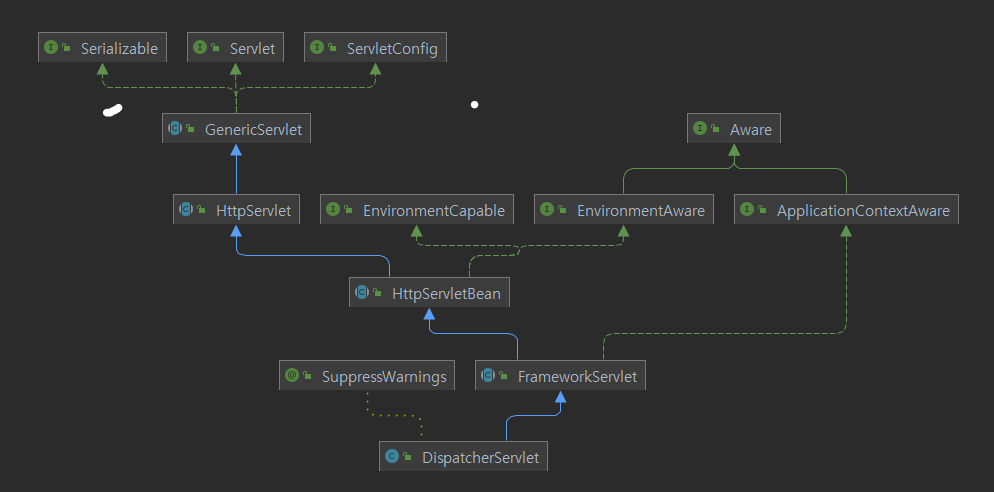 DispatcherServlet 또한 서블릿이다. 그 상속 관계를 살펴보면 다음과 같다.