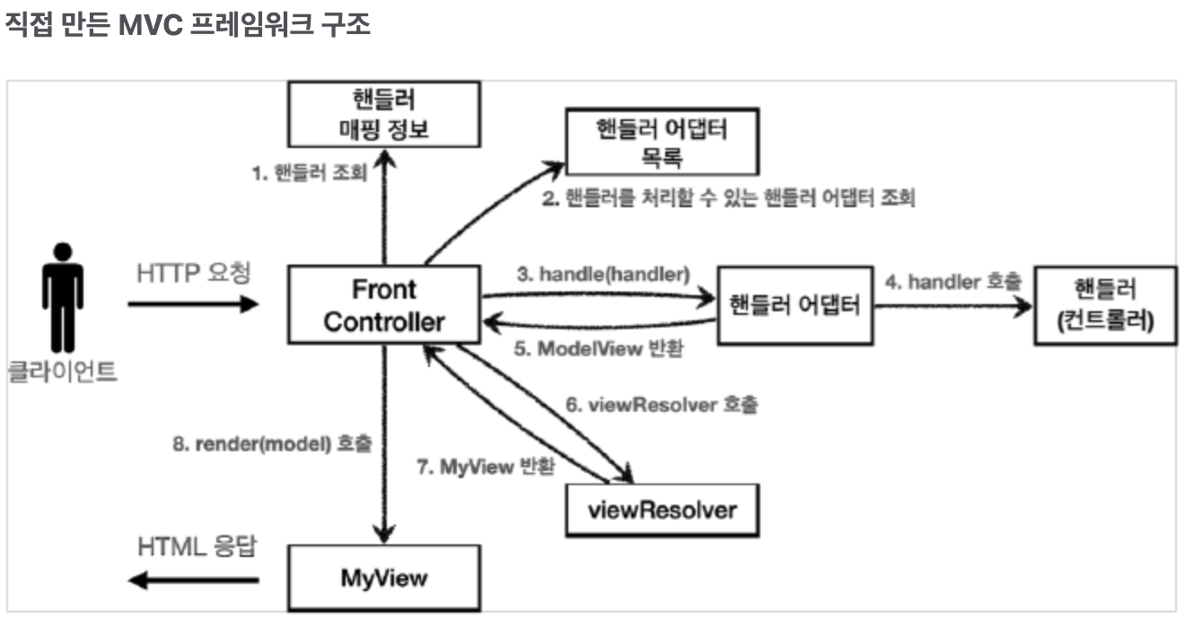 결론부터 말하자면, 우리가 직접 만든 프레임워크와 스프링 MVC의 구조는 놀라울 정도로 유사하다.