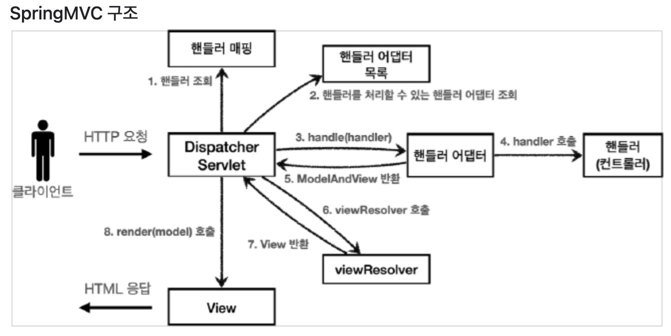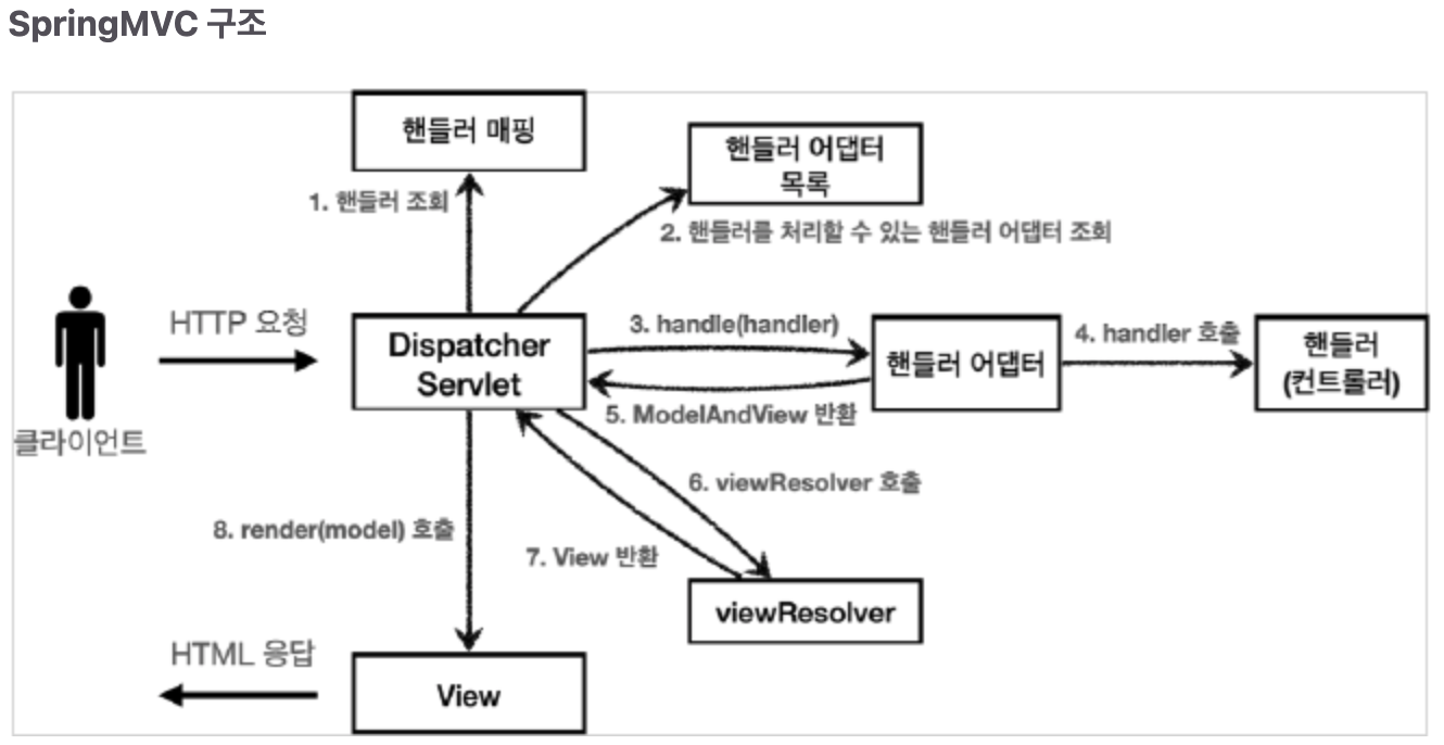- ModelAndView 반환: 핸들러 어댑터는 핸들러가 반환하는 정보를 ModelAndView 객체로 변환하여 반환한다. (데이터와 논리 뷰 이름이 포함된다.)