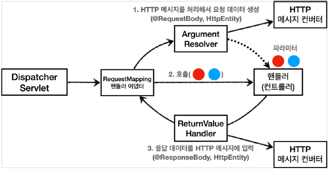 RequestMappingHandlerAdapter(요청 매핑 핸들러 어댑터)를 기억하는가? 이 어댑터가 컨트롤러를 호출하기 전에, 컨트롤러가 필요로 하는 파라미터들을 준비하는 작업을 수행한다.